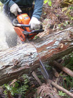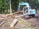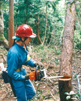 伐採作業の後は、どのような処理をされるのでしょうか?一般的に伐採後は、すぐに枝が取り除かれ、丸太は、運搬しやすいように「造材(玉切り)」を行いま す。造材とは、目的に応じて一定の長さの丸太に切る作業のことを言います。「定尺」と言い、長さは地方によって違いますが、おおよそ、3~4mくらいで す。中には、6mの材が必要な部材もあります。(通し柱やケタ材など) ウッドワークの家具用材の丸太は、4mの長さに造材します。 木の根元を「元」、枝葉の生える末側を「末」と言います。元から末に向かって「一番玉」または、「元玉」、「二番玉」、「三番玉」と続きます。造材した材 は、林道脇などに集められ(集材)トラックなどに積み込まれます。