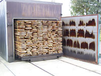 次に人工乾燥(蒸気乾燥方式)です。60°~75°の釜に10日前後、時間をかけて乾燥します。釜の中に入るm3数は、おおよそ15m3です。