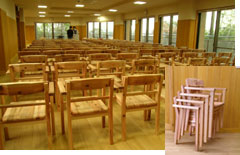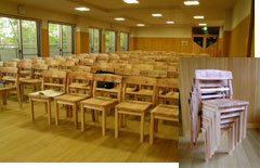 レジデンス日進の竣工式があるため、スタッキングチェアが並べられています。肘無しスタッキングチェア105脚、肘付きスタッキングチェア97脚を納入しました。