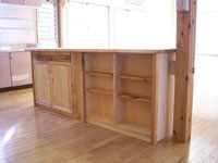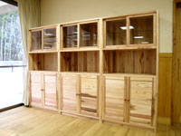 | ■多目的棚 (W900 D400 H1800) 上部の引き違い戸は、クリアガラスを使用しています。棚板は、一枚で3段の可動型です。真ん中は、オープンになっていて、小物が置けるスペースがあります。下部は、観音開きになり、つまみは、リョウガンという、赤い色の堅木を使っています。 |