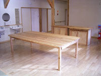 | ■テーブル(12人用) (W2200 D1200 H700) 12人用のテーブルなので、大きな天板が特徴です。木目の模様がはっきりと分かり、杉のやさしい手触りについつい触れたくなりますね。天板の角を丸くし、 当たっても痛くないように工夫をしています。かわいい印象です。奥行き1200㎜の左右には、引出し棚が2個付いています。箸やスプーン、紙ナプキンな ど、ちょっとしたものを収納できる工夫もみられます。 |