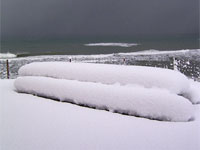 1月の終わり頃、朝起きると、どさっと雪が降り積もり外は、白い世界へと変わっていました。白い世界とは正反対に、海の向こうの空は黒く、朝方だというのに、夜のように真っ暗です。雪の白さがいっそう映えてきますね。雪国でしか味わえない雪景色です。