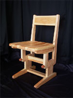 チェアは、デスクと同じようにお子様の成長に合わせ、上下4段の高さ調整ができます。スライド式機能で、25㎜間隔で上下します。上下可動する際に使用 する調整ねじのヘッドは、上越地域産の「リョウガン」を使用しています。座面は、円形に座ぐりが施され、滑らかにへこんでいます。背もたれは、背中の当た りが痛くないように、加工しています。