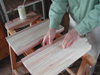 材をただ組み合わせるのでなく、曲がる、反るの方向を見抜かなくてはなりません。もっとも良い木目、色、節の状態を選別して並べます。面と面には相性が あり、相性がよいとつなぎ目がより美しく自然に溶け込みます。また、杉材は特に、赤みと白太がはっきりとしているので、職人の選び方次第で印象が、がらり と変わってきます。コントラストが美しく、家具としての見栄えが引き立ちます。