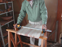 間伐材は、細かな材が多いので、この作業は必要不可欠なものです。これを「巾ハギ集成」といいます。ハタガネという道具を使い、集成をします。