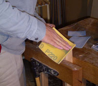 | ①サンダーで脚部をすべすべな触り心地に仕上げてゆきます。 | ②もっと細かいやすりペーパーで仕上げます。 |
