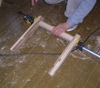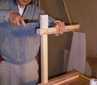 | ③脚部とヌキの組立作業です。ボンドを付けて、カナヅチで叩きます。ホゾ組と言って家具の作りとして一番丈夫で長持ちします。 | ④クランプという道具で、脚部とヌキをしっかり固定させてボンドが固まるのを待ちます。 |