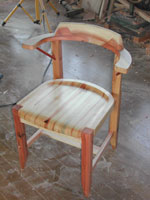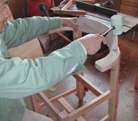 | ⑤脚部と同じように、背もたれや肘つき部材、座面部材を組み合わせてゆきます。 | ⑥椅子の組立が完成すると、最後のヤスリがけでチェックをします。それから植物性オイルで仕上げに入ります。 |