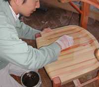 無公害の植物性オイルで、健康に害を及ぼさないものを使用しています。一度目は、オイルを塗るというよりは、染み込ませるようにハケで塗ります。二度目は、とろみのあるワックスで塗ります。艶がでてすべすべな触り心地に仕上がります。