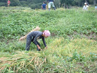 9月の下旬、曇り空の下で、今にも雨がポツリと当たりそうな天気のなか行いました。自分たちの棚田へ向かう途中、無農薬の稲はどんな風に育ってくれたの か楽しみな反面、不安ながらに向かっていました。自分たちの手で稲を植え、そして稲を刈ることができる楽しみは、なんともいえない気持ちです。