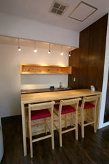 納めた家具は、桧を使用しています。ハイスツールのファブリックは、赤色を使用し、桧との相性はいいですよ。その他、カウンターデスクや壁面 シェルフもウッドワーク製です。桧の香りが、心地よさを高め、消臭効果もあることから、快適に過ごせます。ヒュケリシリーズを手がけたデザイナーの小林さ んがプロデュースされました。